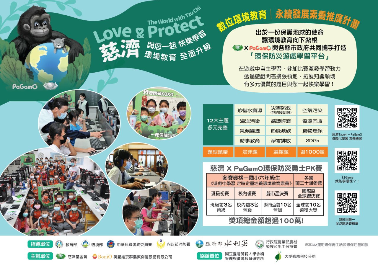 二、 | 永續發展素養與數位環境教育為現代公民必備的態度與知識,「慈濟環保防災勇士養成計畫」三年來深獲縣市政府與各級學校認可,全球已有6個國家地區、超過20萬名參賽者投入,於全臺21縣市辦理縣市盃環保防災勇士PK賽,呈現豐碩環境教育成果。 |