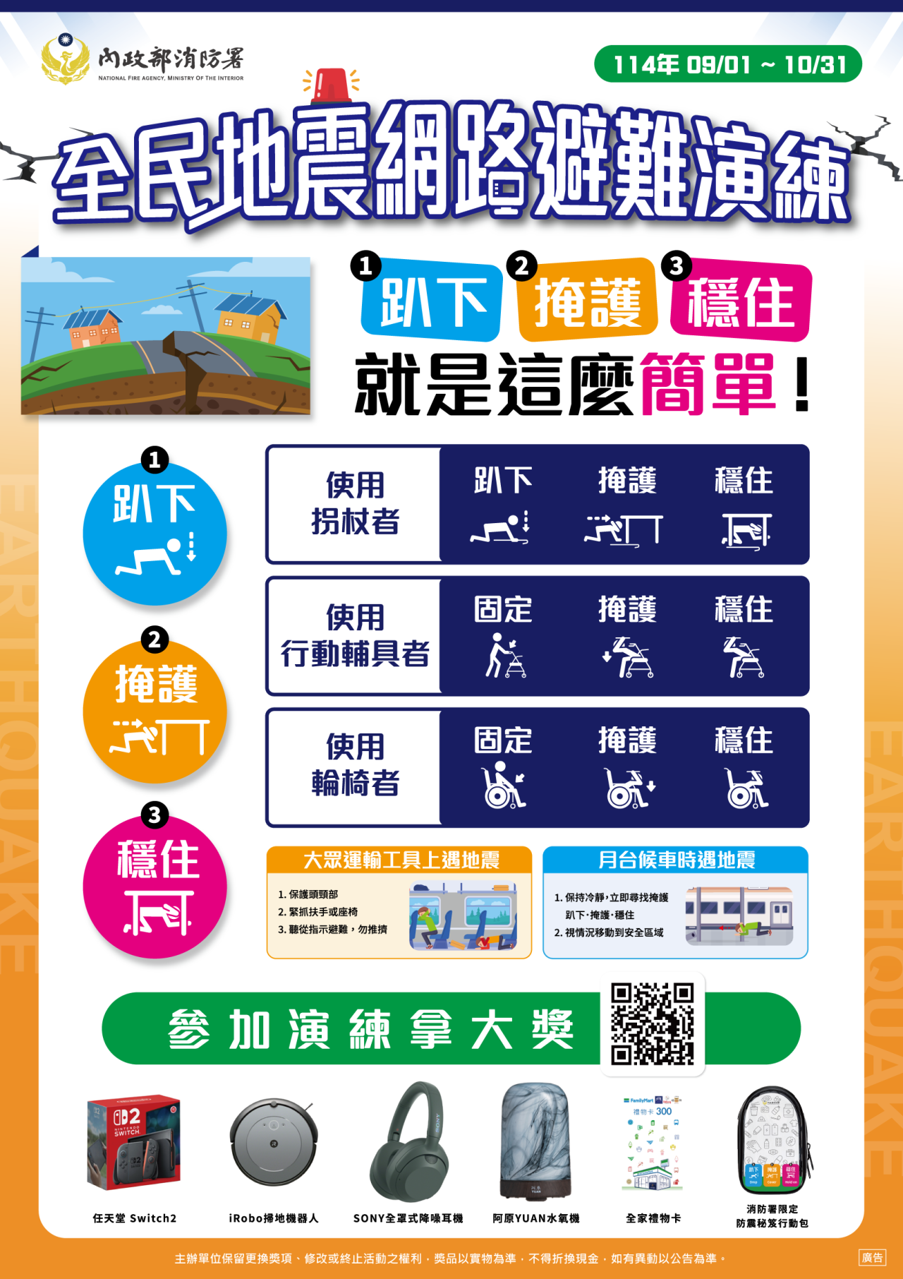 | 四、 | 檢附內政部「114年國家防災日–全民地震避難演練暨防災宣導活動實施計畫」1份與宣導海報4份。 |