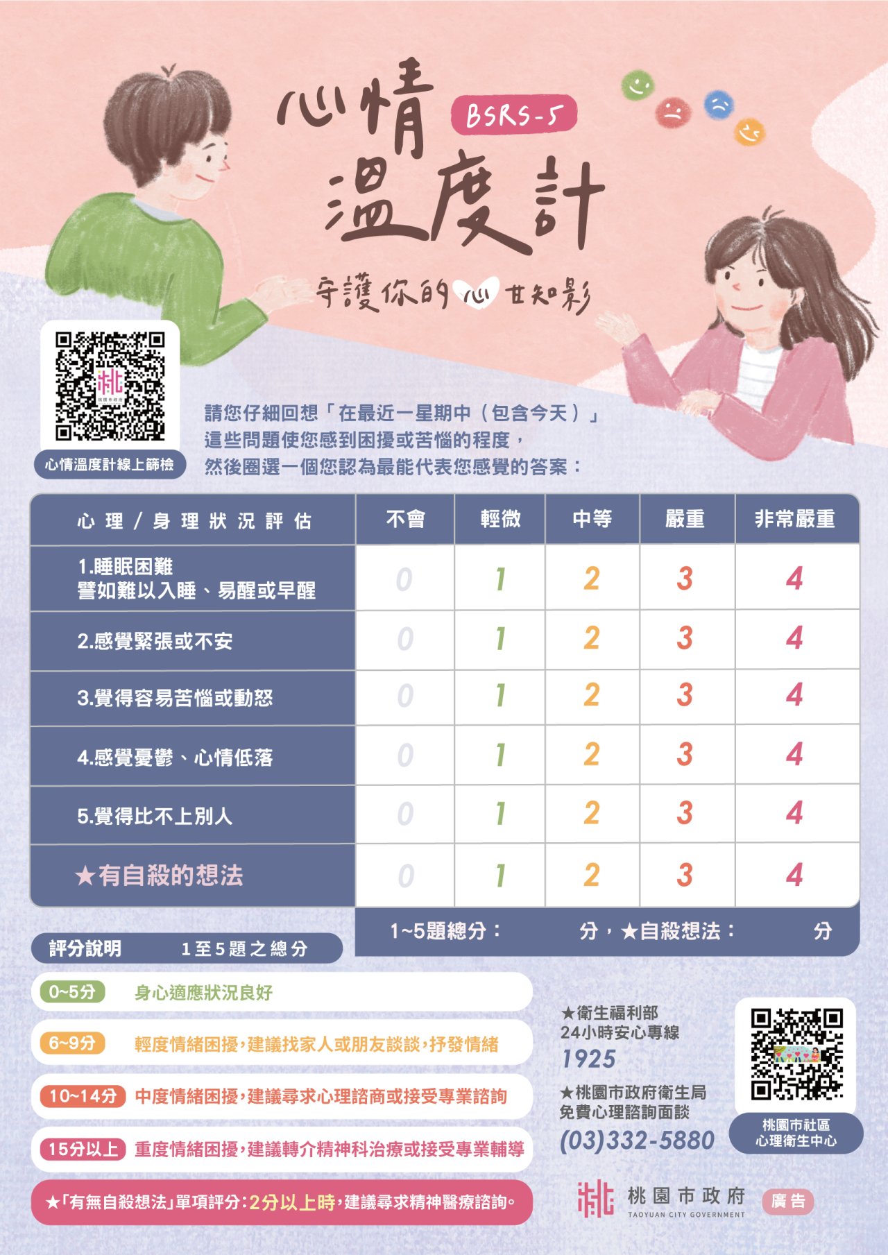 二、 | 為利本府衛生局針對不同性別、年齡、居住區域等民眾進行其心理健康程度差異之統計分析,請貴校將旨案列入宣導活動或辦理課程時,一同請教師、學生或民眾施測心情溫度計(BSRS5)。 |